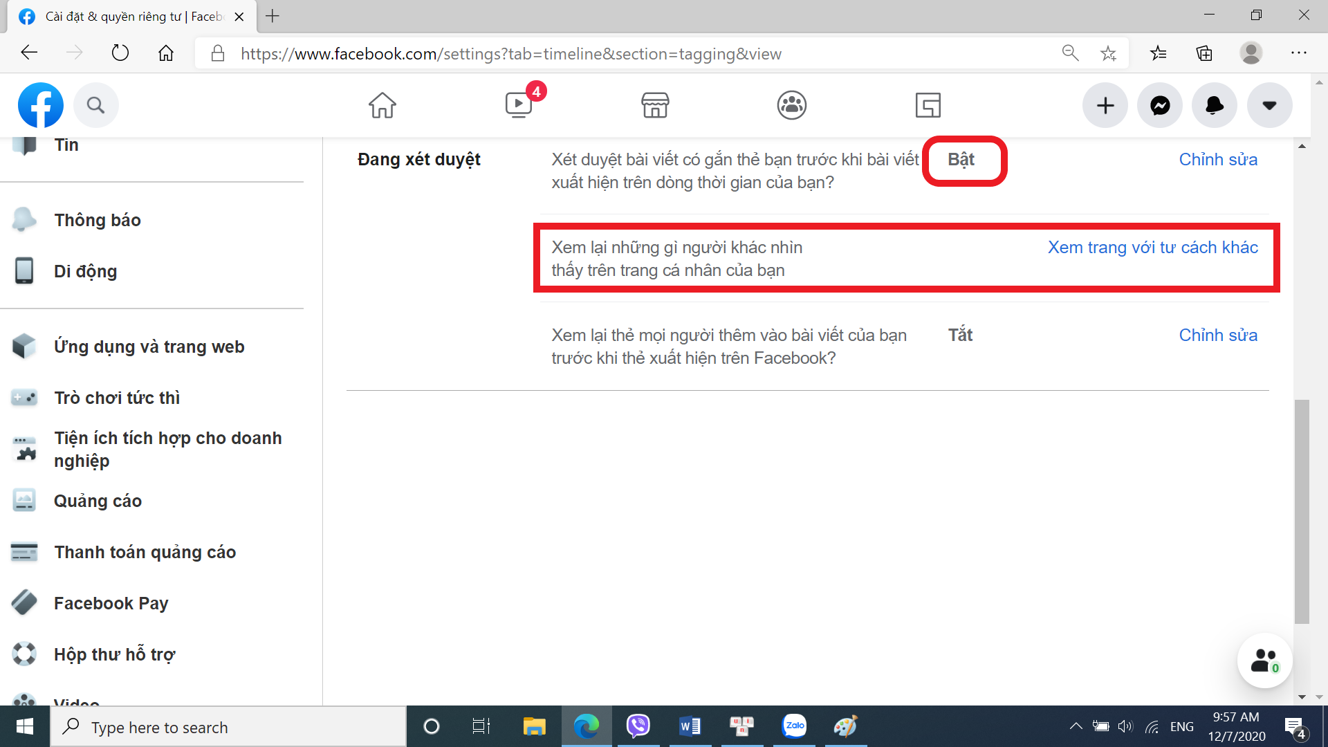 – Phía bên phải, kéo xuống bạn sẽ thấy mục “Đang xét duyệt“, bạn hãy bật lên như hình nhé.